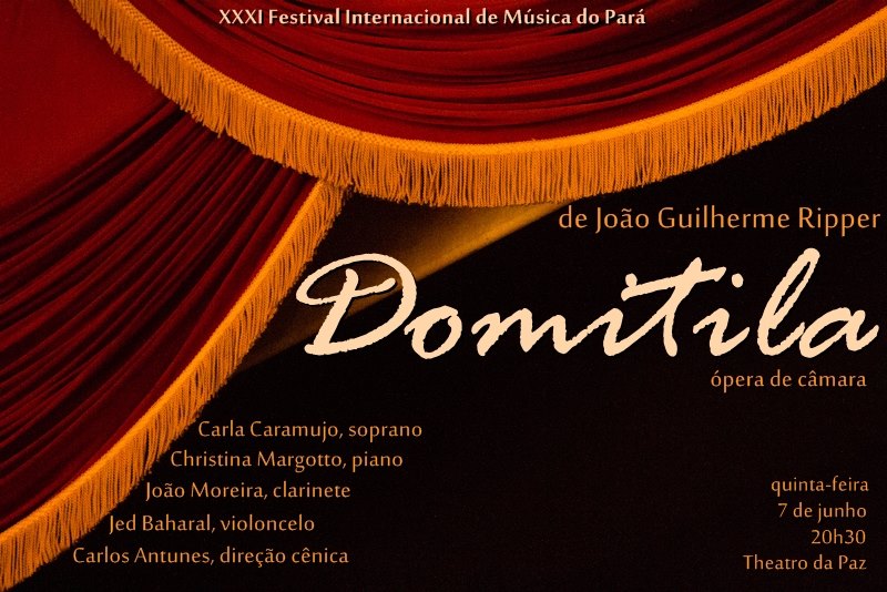 A ópera de câmara "Domitila" será apresentada no dia 7 de junho, no Theatro da Paz, em Belém. A soprano portuguesa Carla Caramujo cantará o papel título acompanhada por João Moreira (clarinete),Jed Barahal (cello) e Christina Margotto (piano), com direção cênica de Carlos Antunes. A apresentação acontece durante o XXXI Festival Internacional de Música do Pará, dirigido porMarcelo Jardim e promovido pela Fundação Carlos Gomes, que tem o pianista Paulo Melo como Superintendente. — em Theatro da Paz.