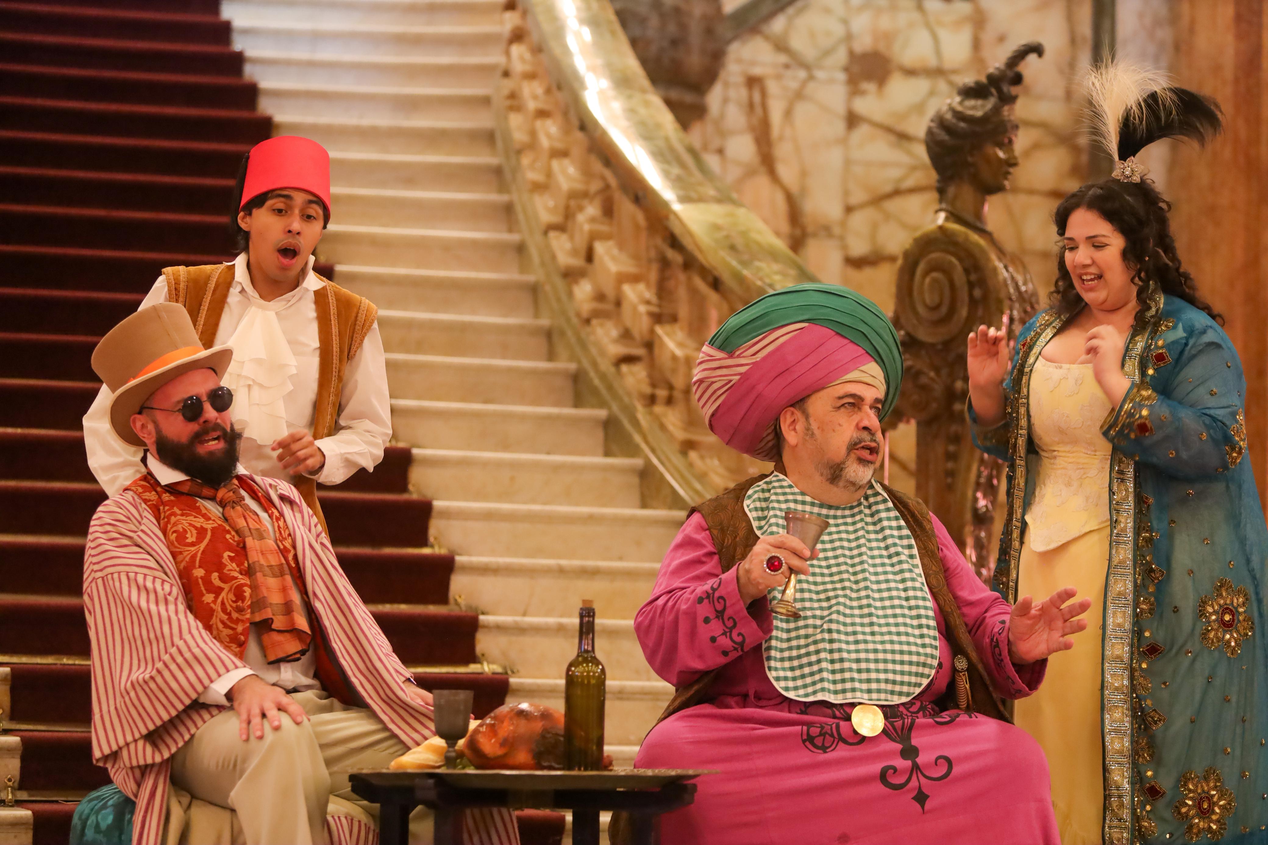 Às 12h, entrará em cena o mais recente projeto do TMRJ, Ópera do Meio-Dia, que retornou ao Theatro depois de mais de 20 anos. Sob a regência do maestro titular do Coro do TMRJ, Cyrano Sales, os solistas vão exibir a comédia A Italiana em Argel, de Gioachino Rossini, na escadaria interna. | |
